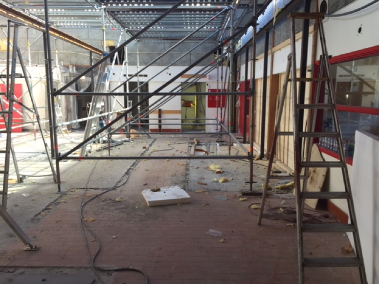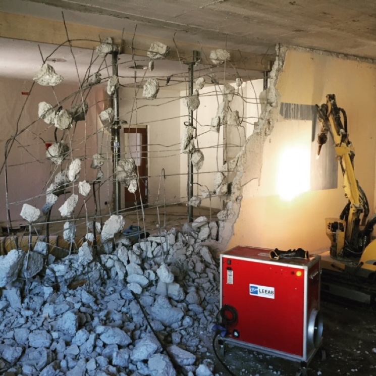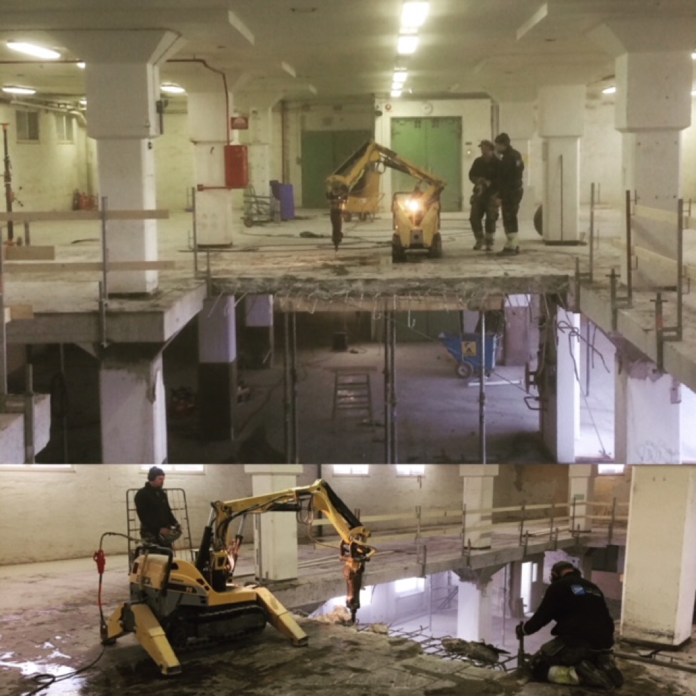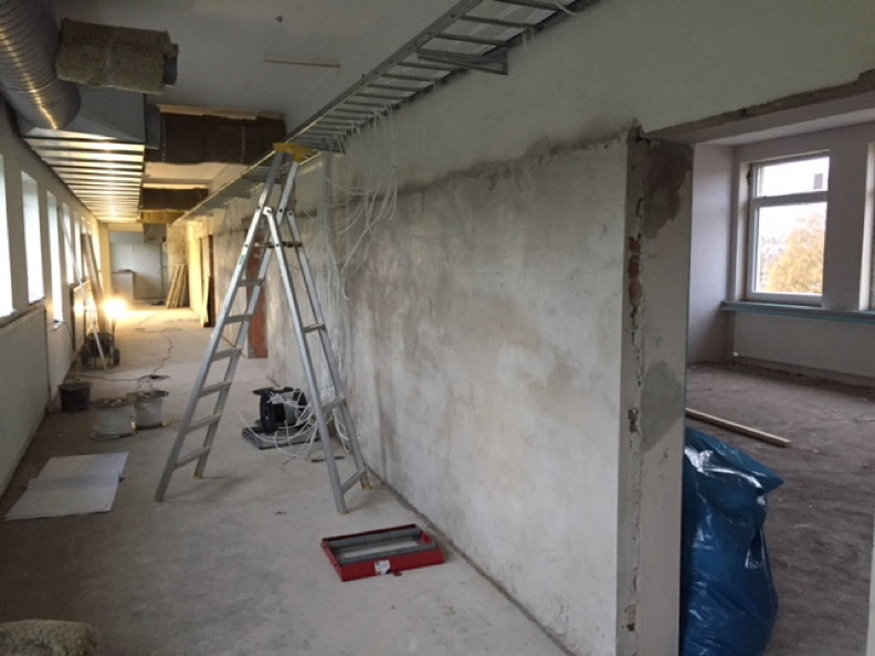 Förberedande arbeten för rivning av tak och väggar, samt borrning för nytt kök på Engelska skolan. Totalentreprenör Hus och Nyproduktion.
